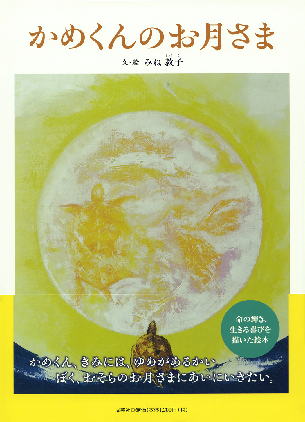ひとりぼっちのかめくんは、いつも池に移るお月さまを眺めています。お月さまに会いに行きたいと願うかめくんに、ちょうたちが声をかけました。「かめくん、ねがうんだ、このそらに。はなってごらん、きみのゆめを。」小さな身体で力強く生き抜くかめくんやちょうたちの姿を通して、命の輝き、生きる喜びを描いた絵本です。