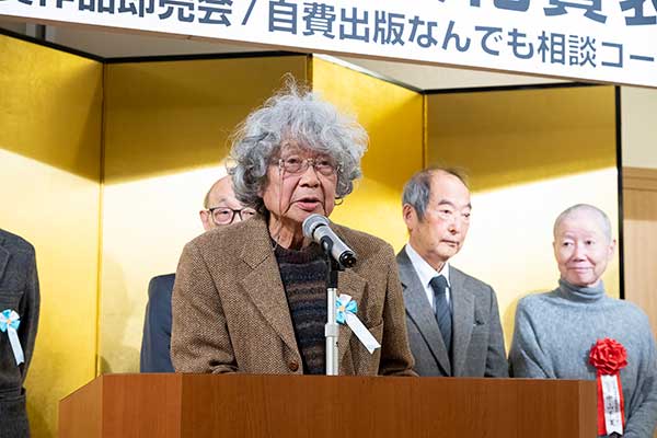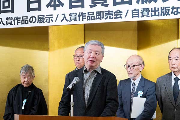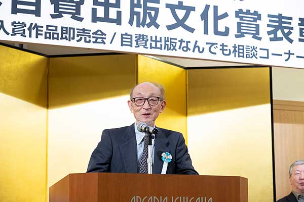 メイン行事の日本自費出版文化賞表彰式では、はじめに最終選考委員会を代表して、鎌田 慧(かまた さとし)選考委員長より、審査の感想、各入賞昨品に対する講評を含めたあいさつが行なわれ、この日本自費出版文化賞の意義を述べるともに入選・入賞者にお祝いの言葉を贈りました。また、この日の表彰式に出席した成田 龍一(なりた りゅういち)委員、中山 千夏(なかやま ちなつ)委員、藤野 健一(ふじの けんいち)委員、秋林 哲也(あきばやし てつや)委員、佐藤 和夫(さとう かずお)委員、小池 一子(こいけ かずこ)委員の各委員もそれぞれ感想を披露しました。