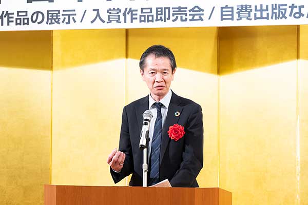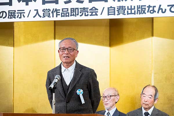 開会にあたり、この日本自費出版文化賞の主催者である一般社団法人日本グラフィックサービス工業会を代表して、岡本 泰(おかもと ひろし)会長のあいさつ、協賛会社を代表して、富士フイルムグラフィックソリューションズ株式会社パートナー営業部の宮本 圭(みやもと けい)様のあいさつ、そして後援団体を代表して朝日新聞社ブランド企画部 企画委員の白銀 泰(しろがね やすし)様のあいさつ代読が行われました。