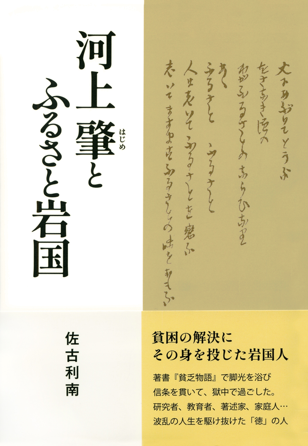 これまで河上肇の評伝は、人々を貧乏から救済しようとマルクス経済学に辿り着き、ために京大を追われ、獄舎では繋がれた繋がれた経済学者の視点からの著述であった。ここでは、学生たちに支持された教育者、天折する長男や運動に身を投じた娘を案じる父親、故郷から捨てられてもなお望郷の念を持ち続けた人間河上肇に焦点を当てる。