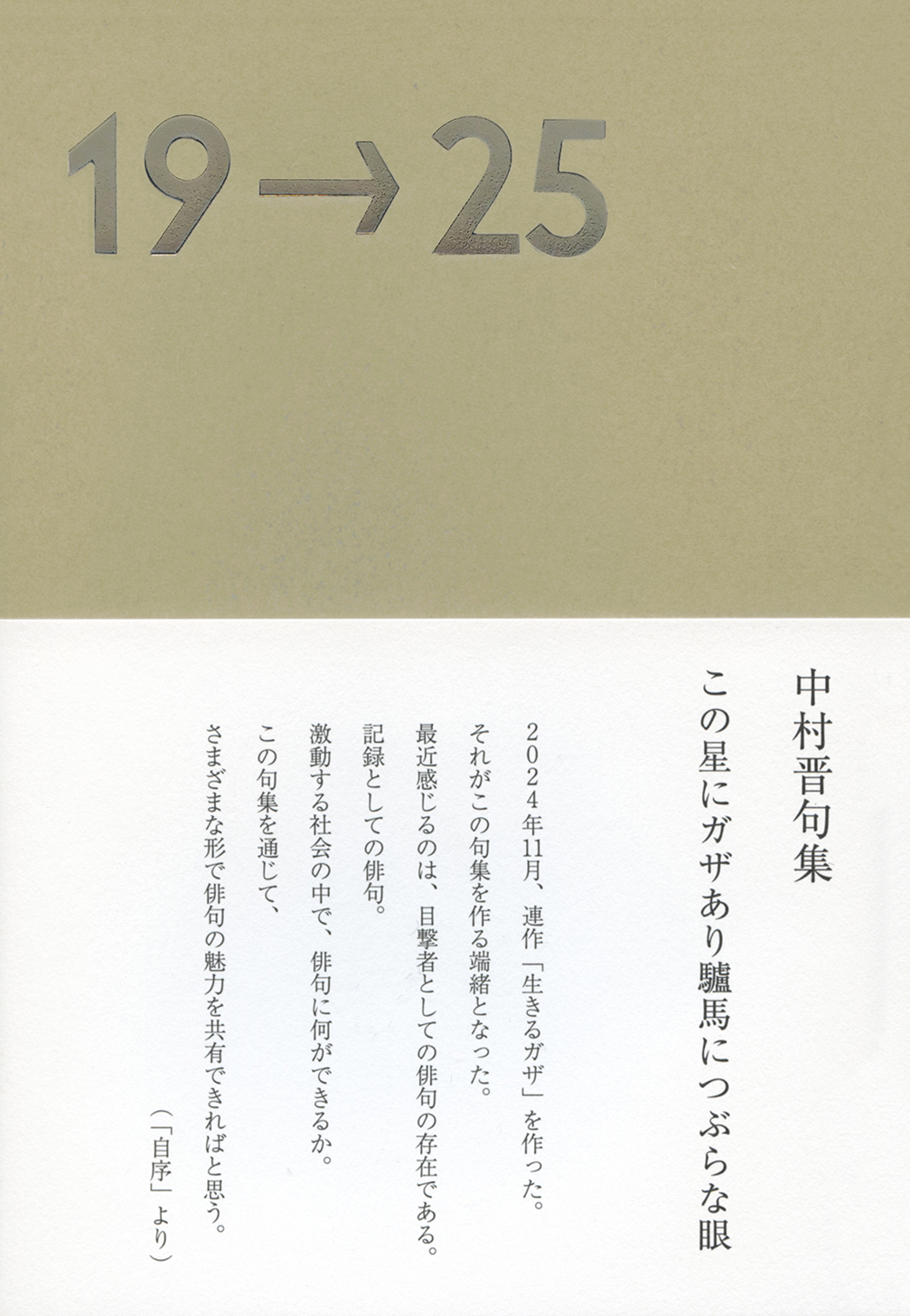 2019年から2025年にかけての作者による俳句作品集。日常のさまざまな場面を切り取った作品を年ごとに編集しつつ、そこに連作「生きるガザ」を織り込んで一冊の句集とした。「生きるガザ」は、「ガザ日記」(アブドゥル・アブー・サイフ著 中野真紀子訳 2024年地平社刊)に基づき、また著作権者の許諾を得て制作した。2019年から2025年にかけての激動期を俳句によって記録したいという思いもありこのようなタイトルを付けた。