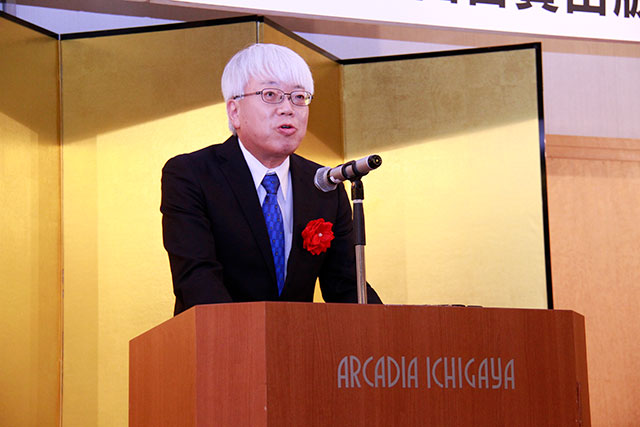最初に、この日本自費出版文化賞の主催者である一般社団法人 日本グラフィックサービス工業会を代表して、中村 耀(なかむら あきら)会長があいさつを行いました。次に、協賛会社を代表して、富士フイルムグローバルグラフィックシステム株式会社営業一部部長の紀 英俊(きの ひでとし)様、後援団体を代表して朝日新聞社CSR推進部企画委員の白銀 泰(しろがね やすし)様がそれぞれあいさつを行いました。